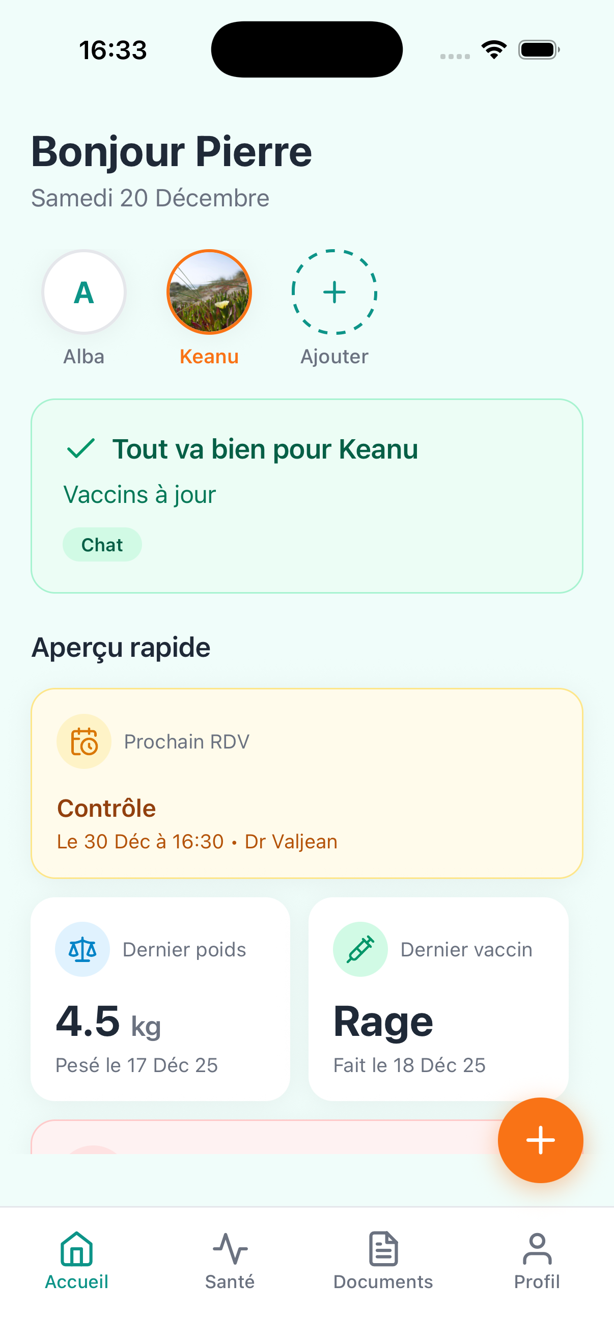 Tout l'historique véto de votre animal. Les dates passées, les prochains rappels. Rien ne vous échappe.